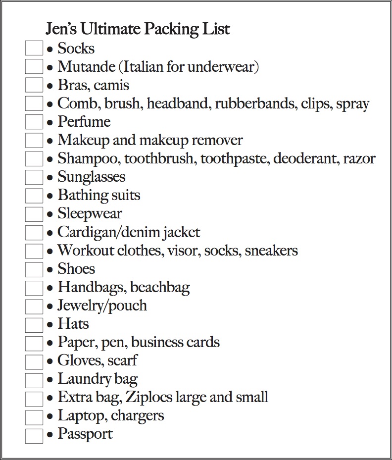 A long time ago I actually created a document I called Jen’s Ultimate Packing List to help me pre-pack for trips. It was an easy print out that bulleted all of my toiletries, chargers, frequently forgotten items including Ziploc bags, hair ties, business cards and sunglasses, and reminded me to pack a laundry bag in which to haul back all of my worn clothes. Although the UPL doesn’t help me decide on day-to-day outfits, it does cover all other items I will need.