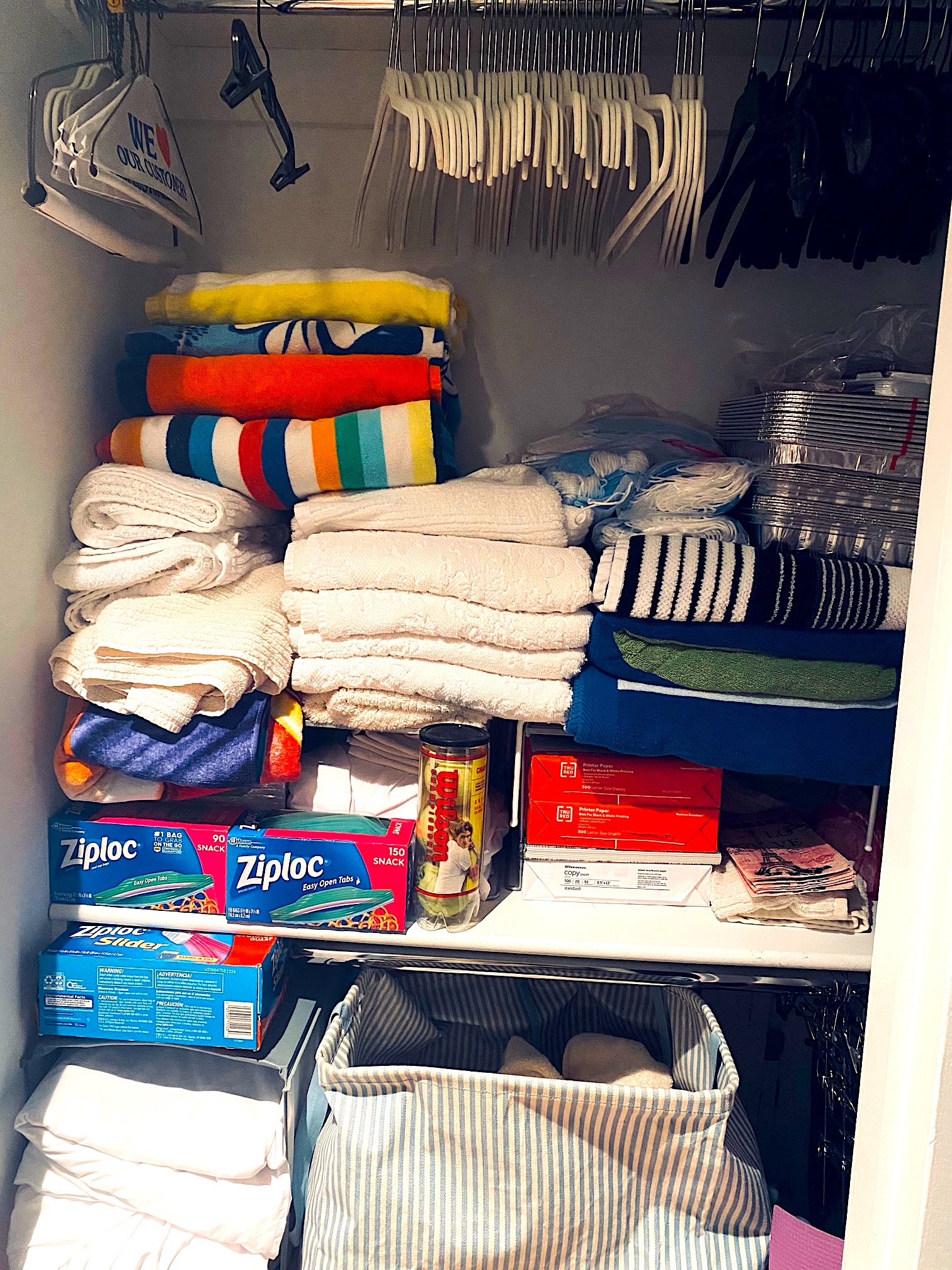 No mate means you’ve been banished to the hanger precinct– a totally separate section located in the hallway linen closet that houses dirty laundry, boxes of extra Ziplocs in snack, quart and gallon sizes, seven or eight heavy nylon dry cleaning sacks from various cleaners throughout New York City that brandish every apartment number I’ve ever rented, Fabreeze dryer sheets, three 12-packs of plain seltzer, a few old beach towels from an annual Atlantic City corporate function that I can’t bear to part with, 500 extra surgical masks, aluminum baking tins, three gallons of half-used Benjamin Moore Decorator’s White paint, a purple yoga mat, paper hand towels for the guest bathroom with a Paris theme, one can of tennis balls in neon green, several unopened reams of printer paper, non-denominational wrapping paper good for any occasion, and hangers grouped by function (clip, shirt, pant, extra strength, scarf) on a high bar above all the lower shelf commotion. Yes, I literally raised the bar to accommodate my collection.