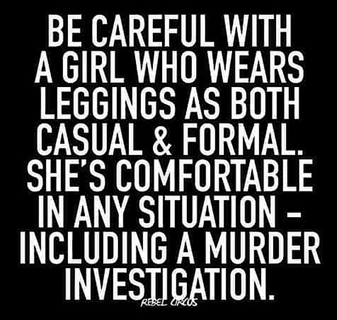 “Those female cops on all of those shows are always in button down shirts and blazers. Dude, I’d totally be in sweatpants or leggings if I were investigating a murder! And less if I were committing one.”