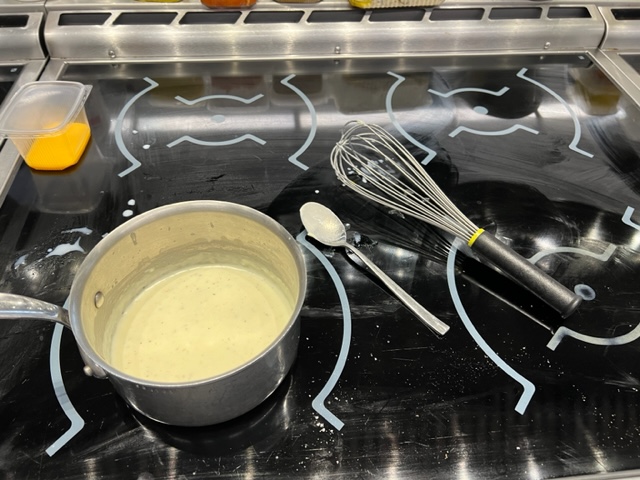 Our final task was to create a Béchamel that later became a Mornay Sauce. We started by whisking clarified butter together in a hot pan with flour to create a roux. Milk, salt, pepper, and grated nutmeg were then gradually added to the roux. The clatter of furious whisking ensued. Four minutes later we had our béchamel sauce. To turn this into Mornay, we took our pans off the heat and added an egg yolk with more whisking so as not to cook the egg! Oui, Chef! And then finely grated Gruyère and butter were added and combined. This sauce was poured over cooked pasta and then heated under the Salamander with more cheese to brown the top, dotted with extra butter. Et voilà!