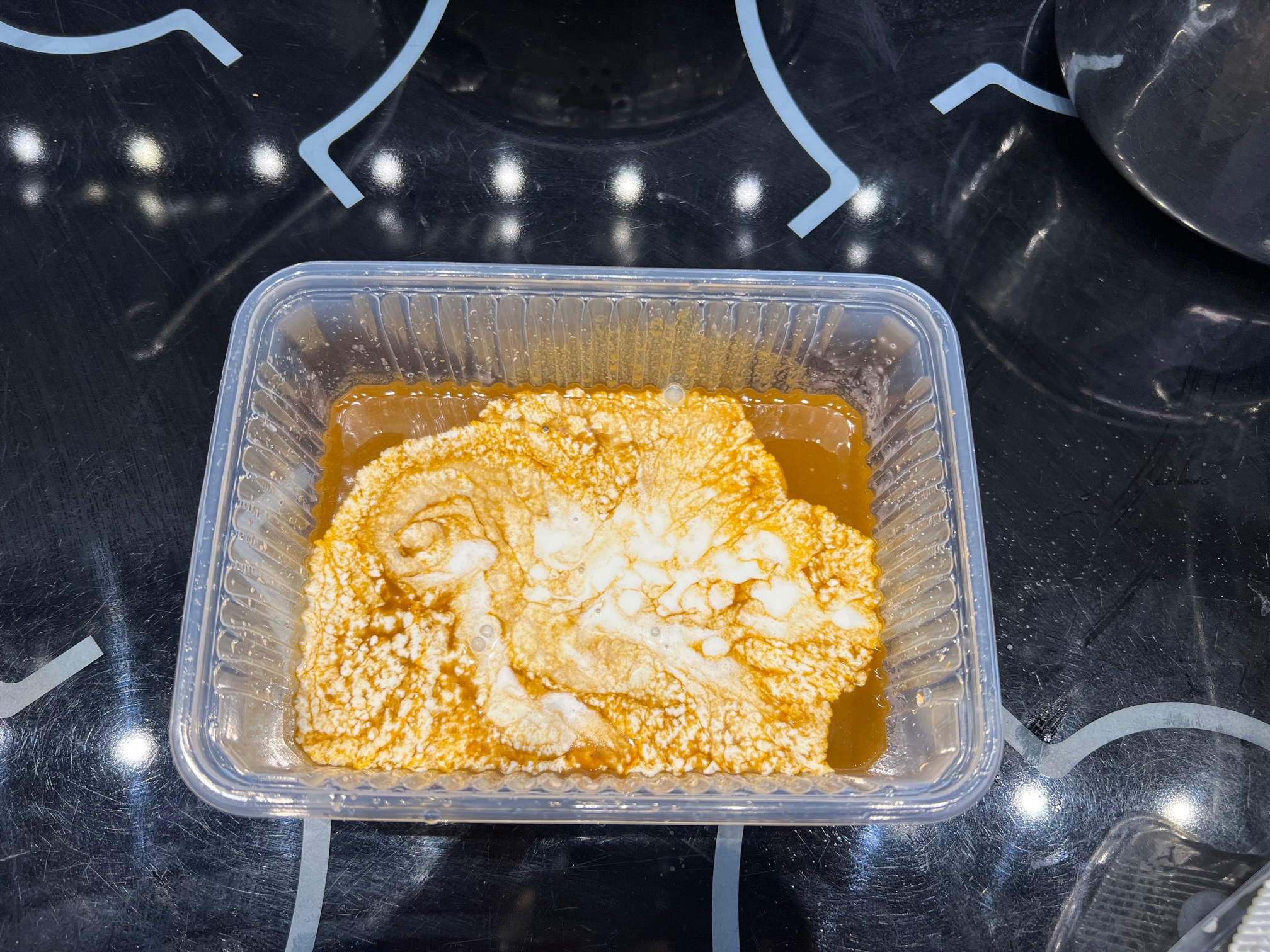 The final sauce of the first section was an Aioli. We started with a pre-prepped container of small potatoes, and saffron in chicken broth. We smashed more garlic and added it to our hot pan with the broth mixture. We were told to whisk and mash the potatoes to achieve a smooth mixture. Oui, Chef! Next we slowly added two egg yolks, whisking furiously so that the eggs combined without cooking. Finally we slowly streamed in olive oil whisking the whole time until we achieved the consistency of a mayonnaise. (No pics of this as I whisked the whole time!) We seasoned it with salt and pepper. Et voilà!