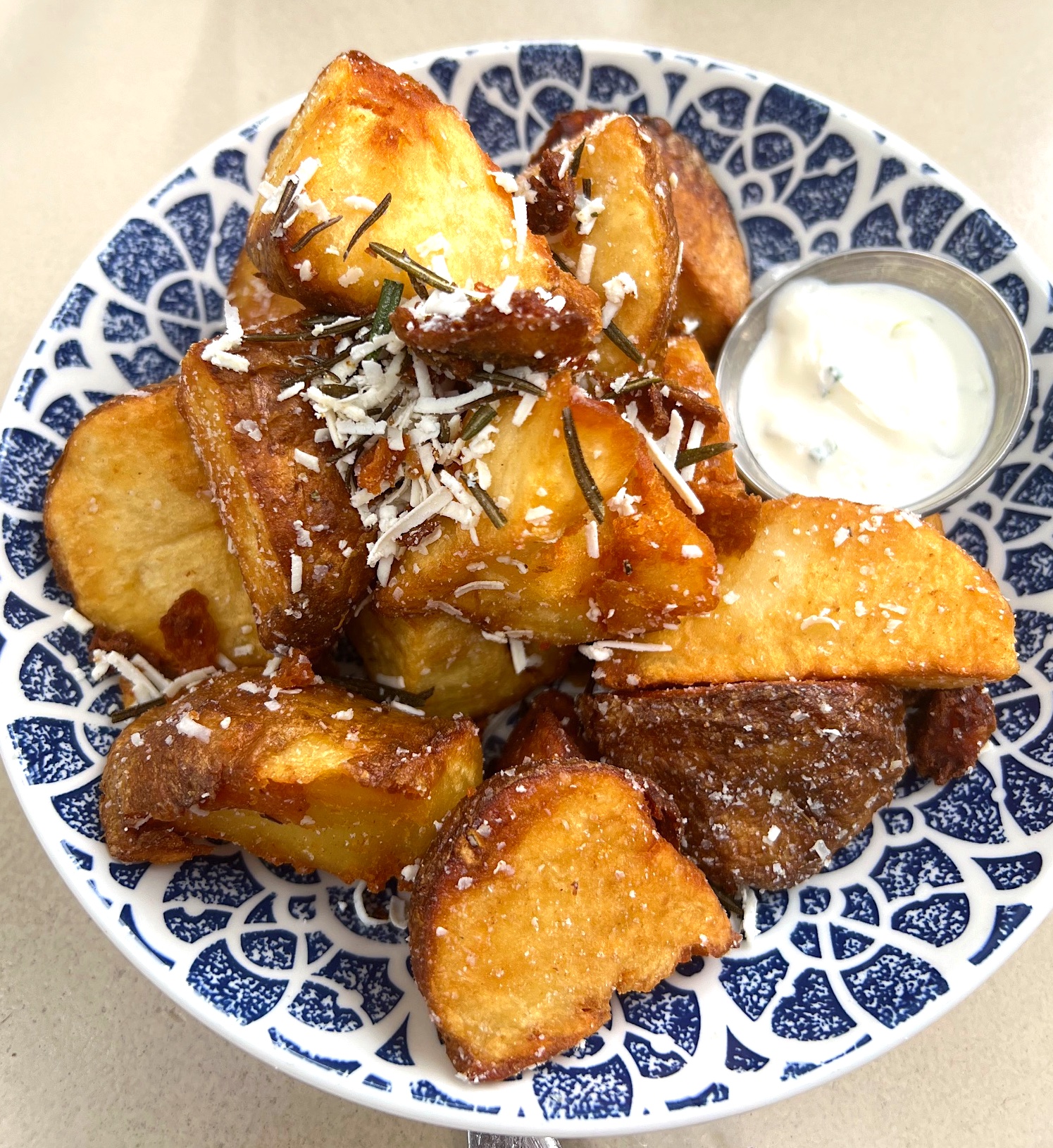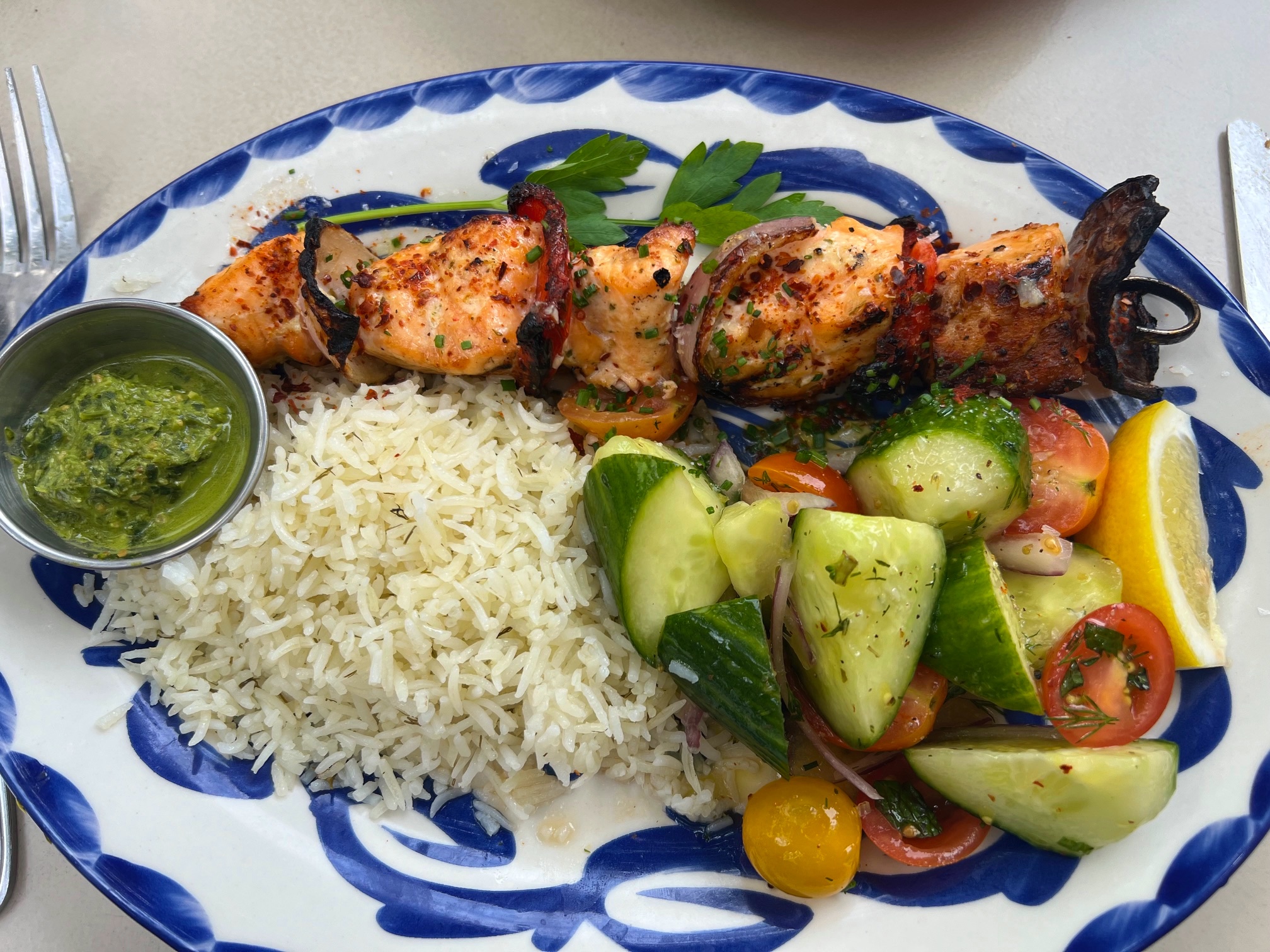 For our main course we each had a single Kebab seasoned with olive oil and lemon that was accompanied by a just-picked tomato cucumber salad, basmati rice, grilled red onions and sweet peppers, and a ramekin of aromatic zhoug for dipping. We added the Crispy Potatoes for the table that had mizithra, rosemary, and a silky-smooth scallion crema sidecar. Every single thing we ordered was super fresh and delicious.