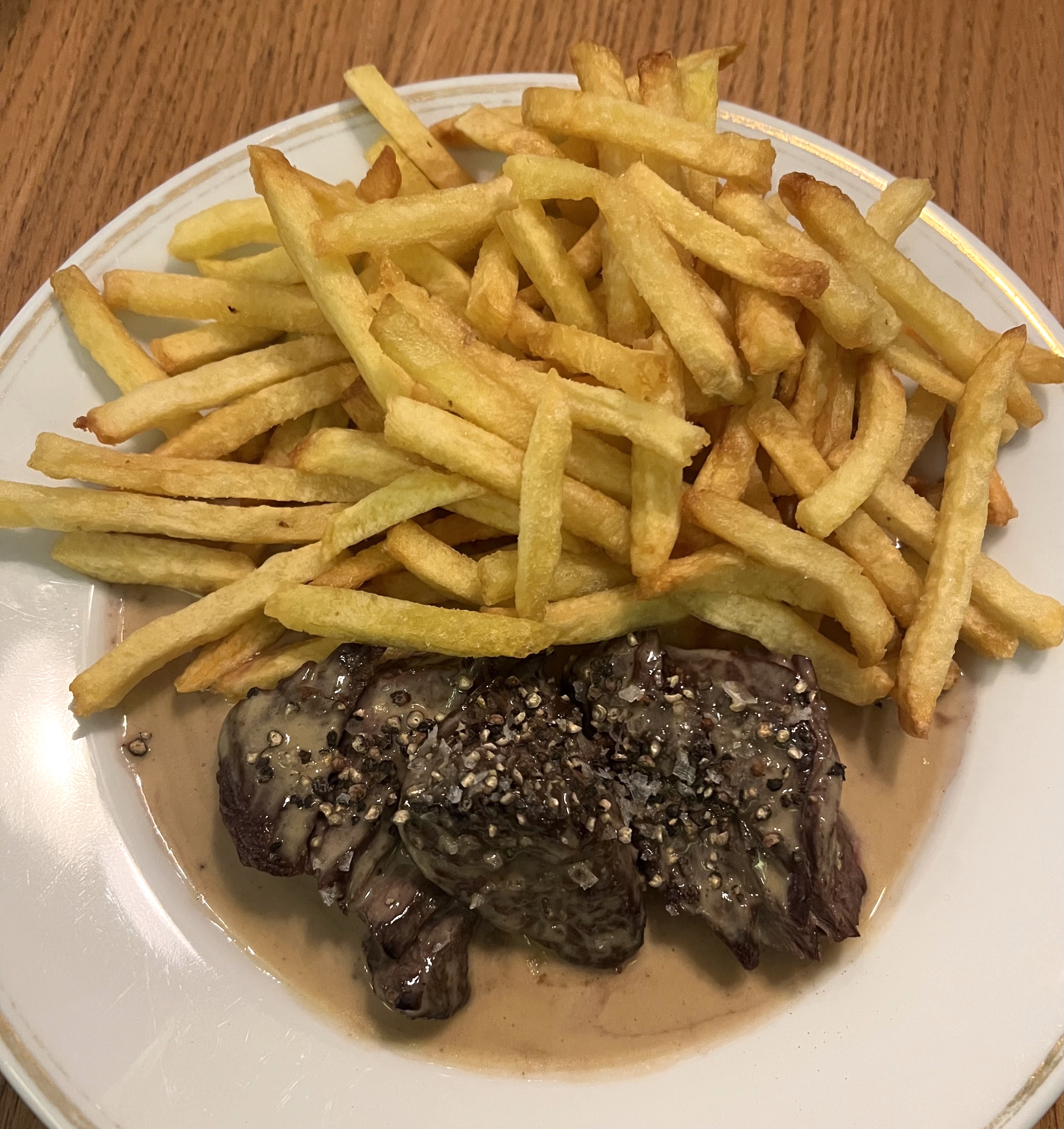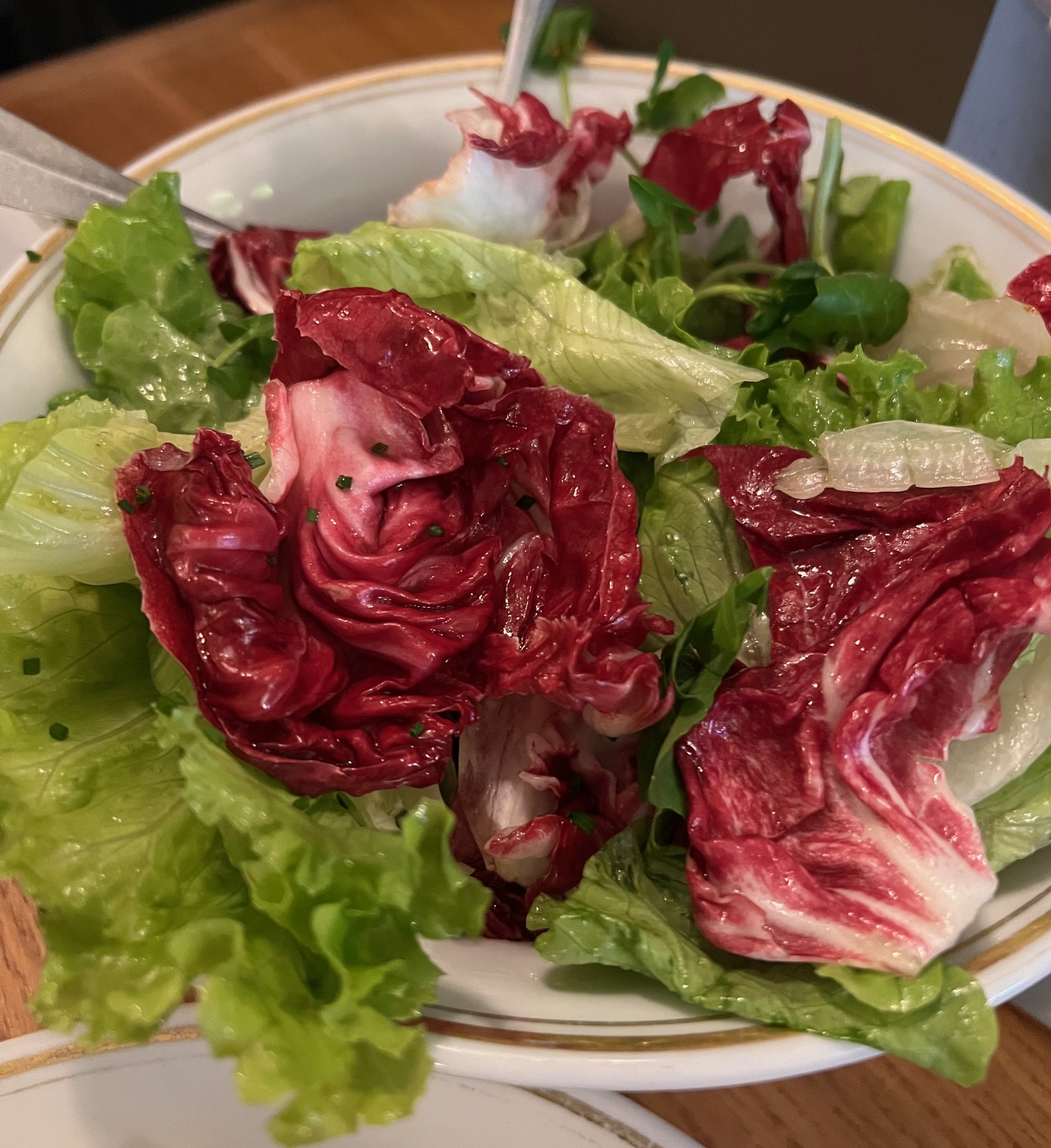 First of all to say that the portion of potatoes on this plate is obscene is putting it mildly. Those golden fritters have the perfect crispness and just the right amount of salt to be completely addictive. And the steak. Whoa. The meat is super lean, grass-fed, aged for thirty days, and the au poivre (peppercorn) preparation brings just the right amount of spice and crunch. The standout here that takes this unbeatable combination to the stratospheric next level is that these two components sit atop the richest, most decadent savory cream sauce I have ever sampled in my life, bar none. I took every fry for a long swim and made sure each bite of steak soaked up the sauce, too. This dish was life affirmingly good. They do have other things on the menu, including a particularly good side salad with a shallot vinaigrette with tiny chives. But please but don’t even show your face here if you’re not having the Steak Frites– you’d be occupying precious real estate reserved for visitors desperately seeking a taste at this intimate eight-tabled gem.