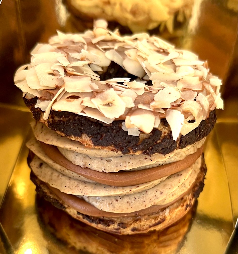 The third and final sweet treat was the Paris–Brest– one of my all-time favorite snacks. A Paris–Brest is a classic French pastry featuring a crisp, almond-studded baked ring of pâte à choux that’s split in half horizontally, liberally filled with praline crème mousseline—a heady mixture of vanilla pastry cream, nutty praline paste, and whipped butter—and finished with a dusting of powdered sugar. At Cedric’s, he uses a cocoa hazelnut ring, adds a layer of caramel crème, and tops the ethereal concoction with flaked almonds. There are almost no words for how light, soft, sweet, and dreamy this wonder tastes.