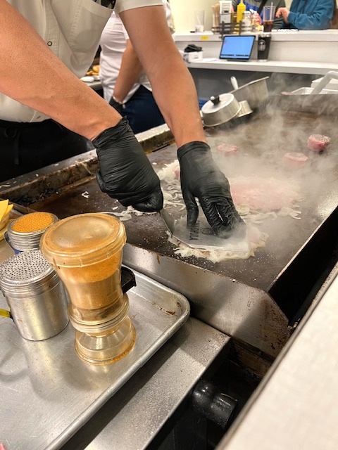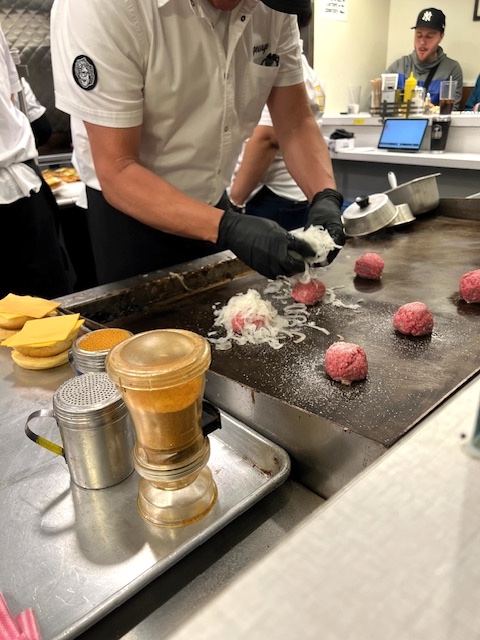 We went on a Sunday and lined up outside on Houston Street as the chilly afternoon sun was setting on the west side. The line for takeout seemed a bit more brisk, but we wanted the full experience of watching all the action and a chance to actually see the man himself at the flat top cooking. Our patience paid off. We were ushered inside and scored prime grill seating with the smoke, sear, and sizzle front and center and George himself at the helm.