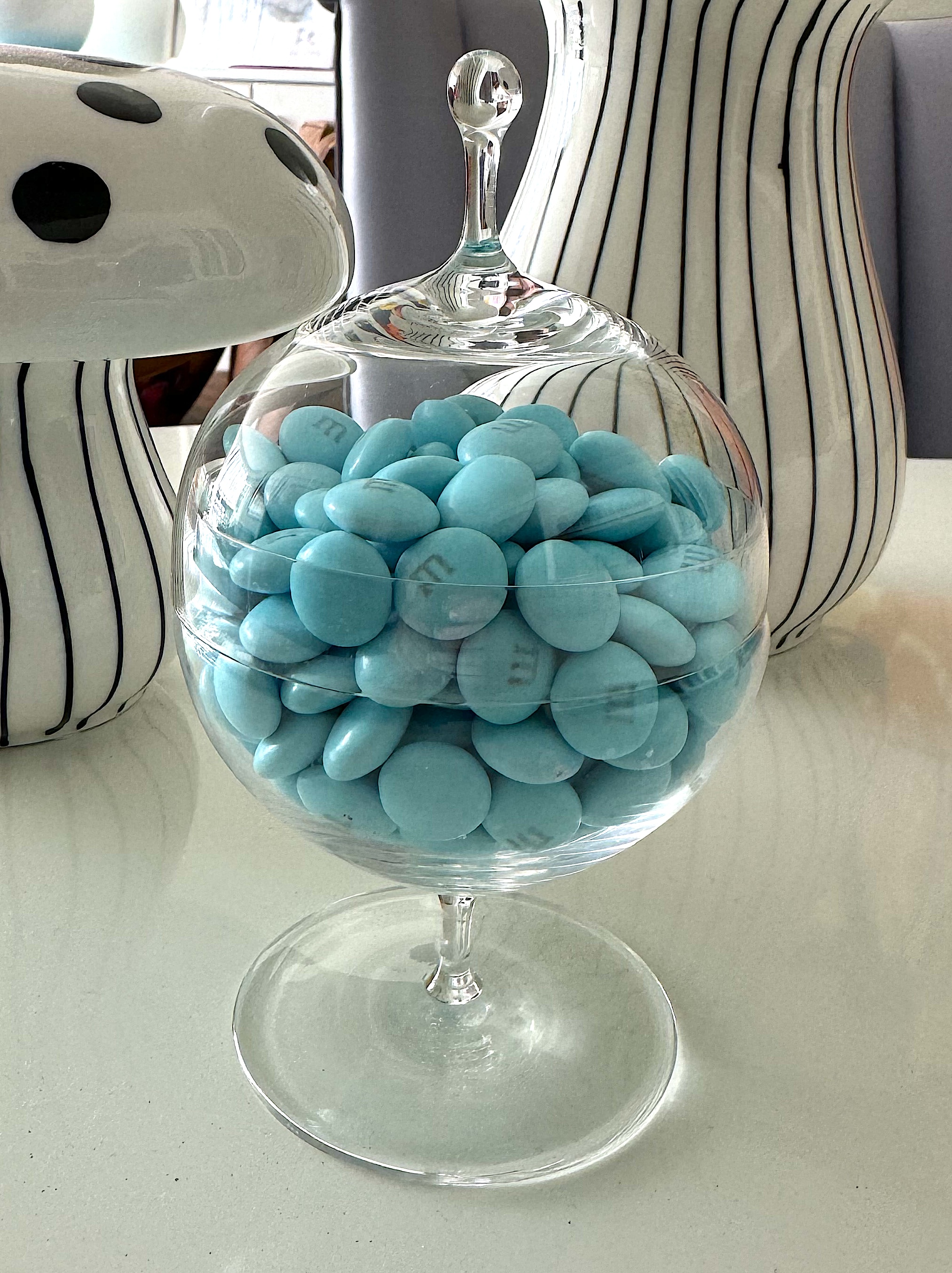 But the glass of this particular candy dish itself was so fine. And the top so architectural with a sculpted tip. I literally could not avert my gaze. I was shopping that day for a house present for a friend and ended up spending the majority of HER budget on that dish for ME! (Bad friend alert.) But I was possessed and had to have it. After which I was then forced to buy a too expensive bag of single-color M&Ms just to show off the shapeliness of the jar. Jeez. But man, she was lookin’ fahhhhhhn. I look at her each and every day and don’t regret the purchase for a moment. She is truly art.