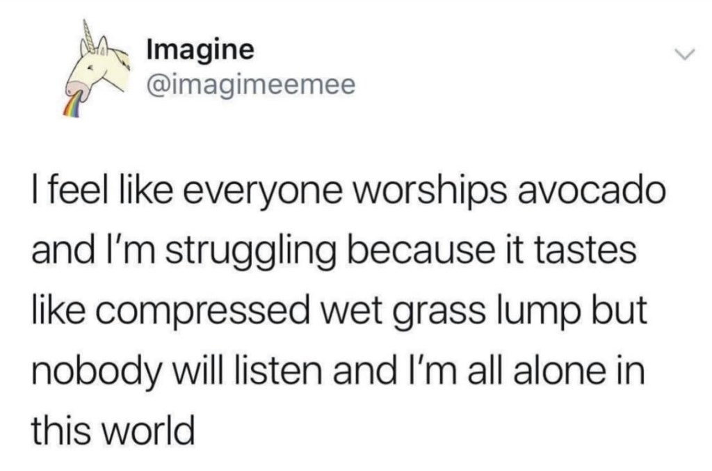 “Everybody thinks they have good taste and a sense of humor. But they couldn’t possibly all HAVE good taste and a sense of humor!” This is one of my very favorite quotes from the movie When Harry Met Sally. I never judge anyone’s taste… well actually that’s not true. (Gotcha!) I never judge anyone’s tastebuds. You’re allowed and encouraged to like what you like. And as long as I don’t have to eat it, have at it! And for me this includes licorice, raw peppers, and (gasp) coffee. Topping my list as many of you know is avocados– I’ve never had one and refuse to try guacamole.
