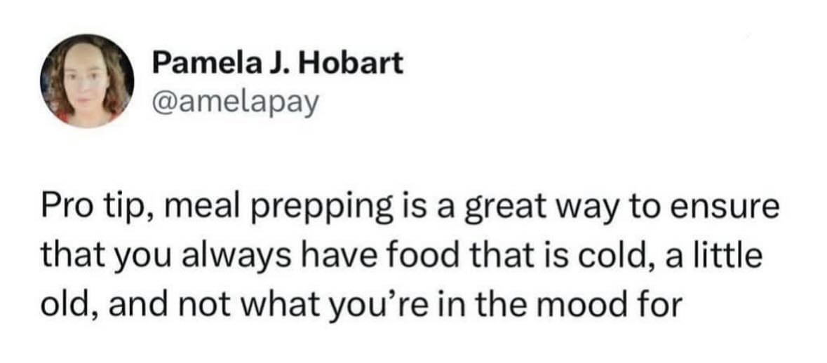 And speaking of taste and foodie habits, I know there are countless videos and how to’s out there describing meal prep. Start your week right by making all of your lunches for the work week on Sunday! Here are five mason jars. Fill them each with salad greens, black beans, corn, salsa, and chicken. Pour homemade twelve ingredient dressing over the top. Lids screw on tight and then each day just shake and serve. Ta-da. Sorry Sara, no thanks. While it’s true that I’d be psyched for that jar on Monday, I don’t want to eat the same exact thing every single day like I’m in limited ingredient prison. And B, do you really think the chicken you made on Sunday will even be edible on Thursday? Won’t the salad greens be wilted and gross by Friday? Meal prep is a wonderful idea but throwing out food will invariably follow if think you’re getting ahead by wasting your groceries.