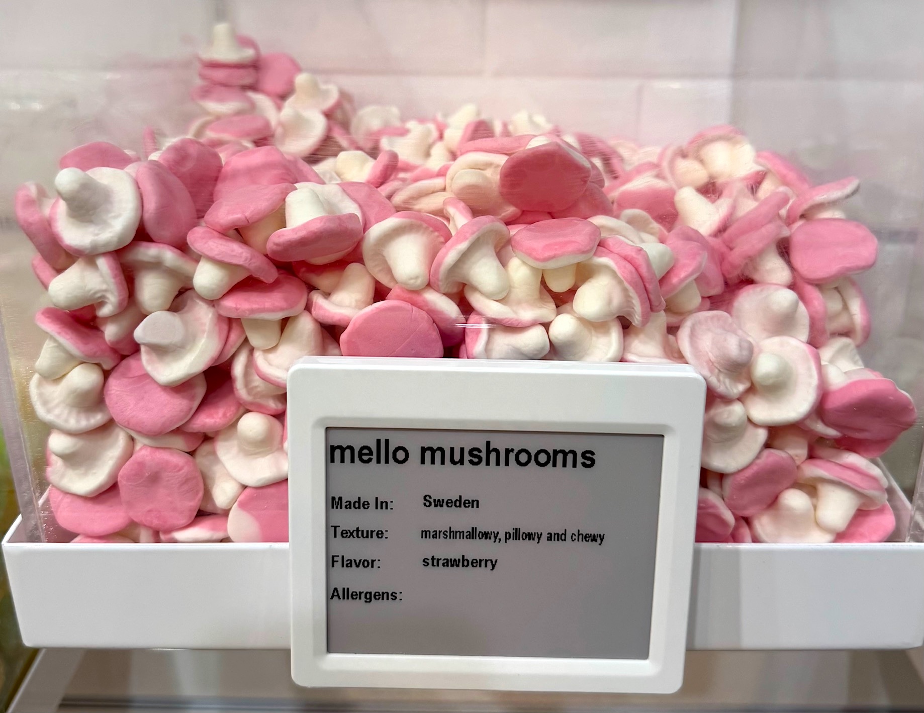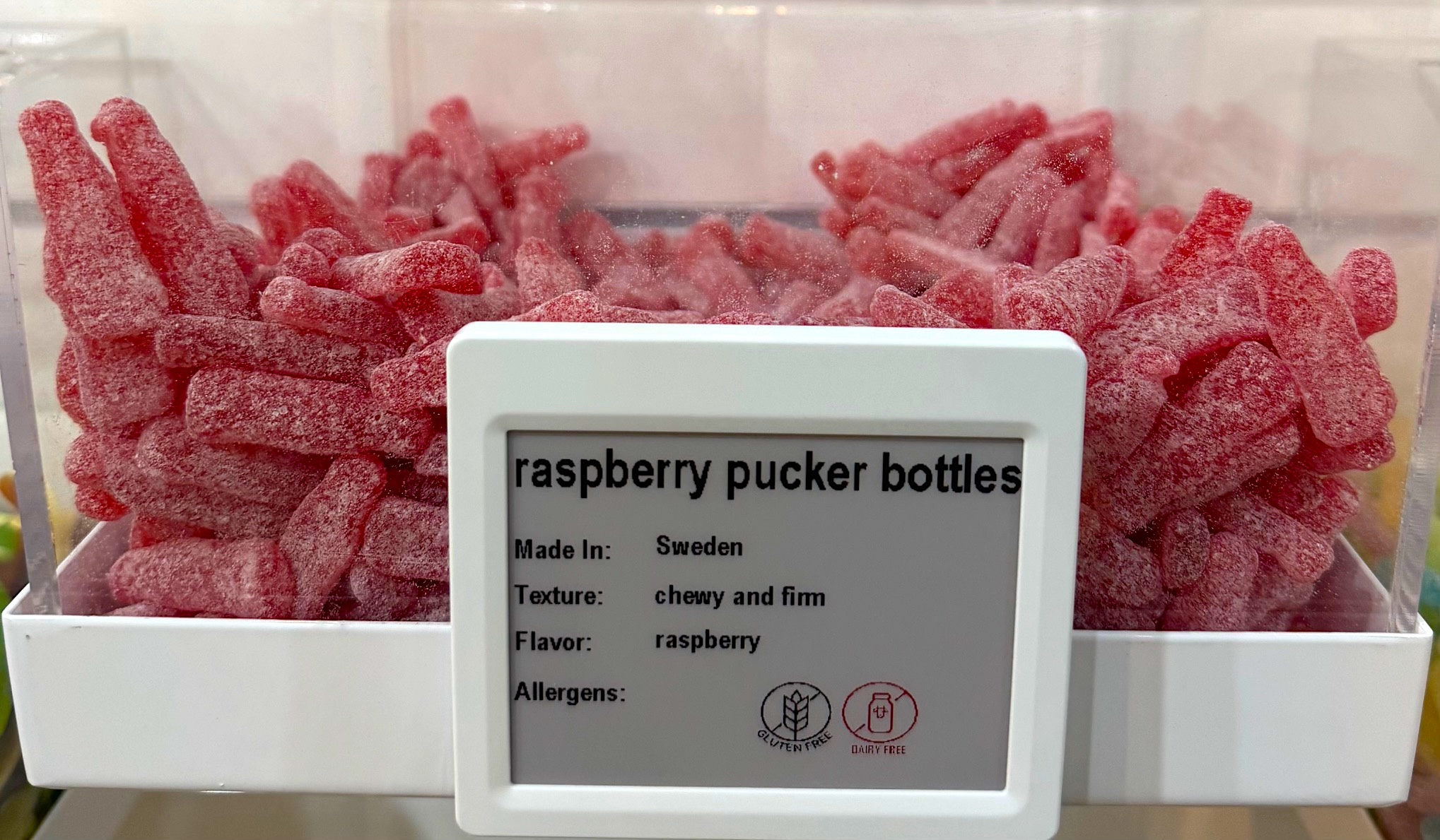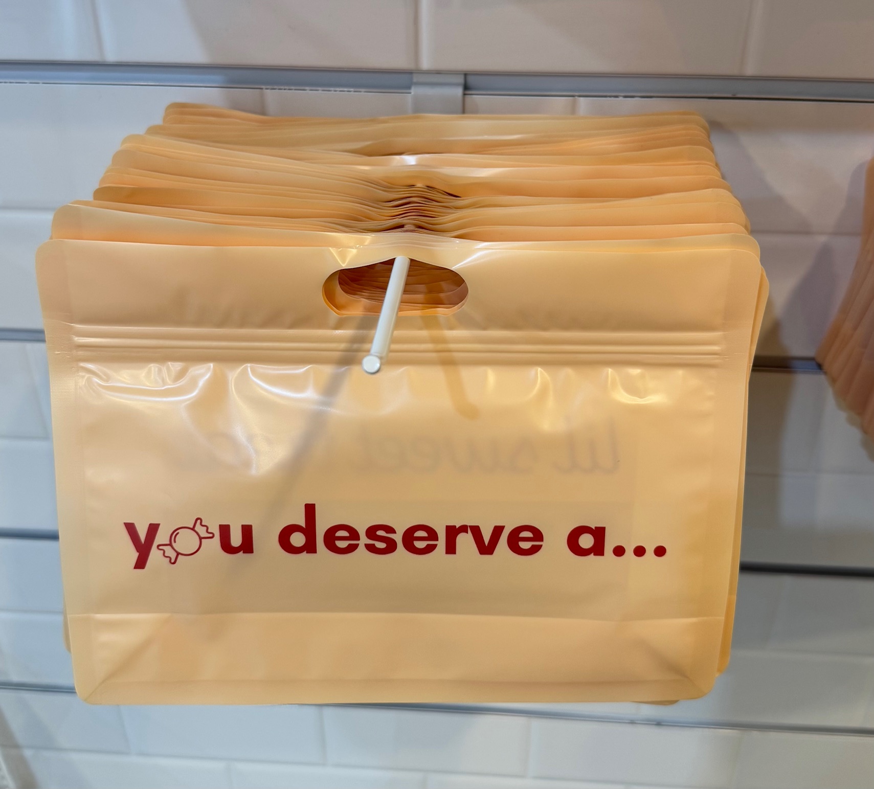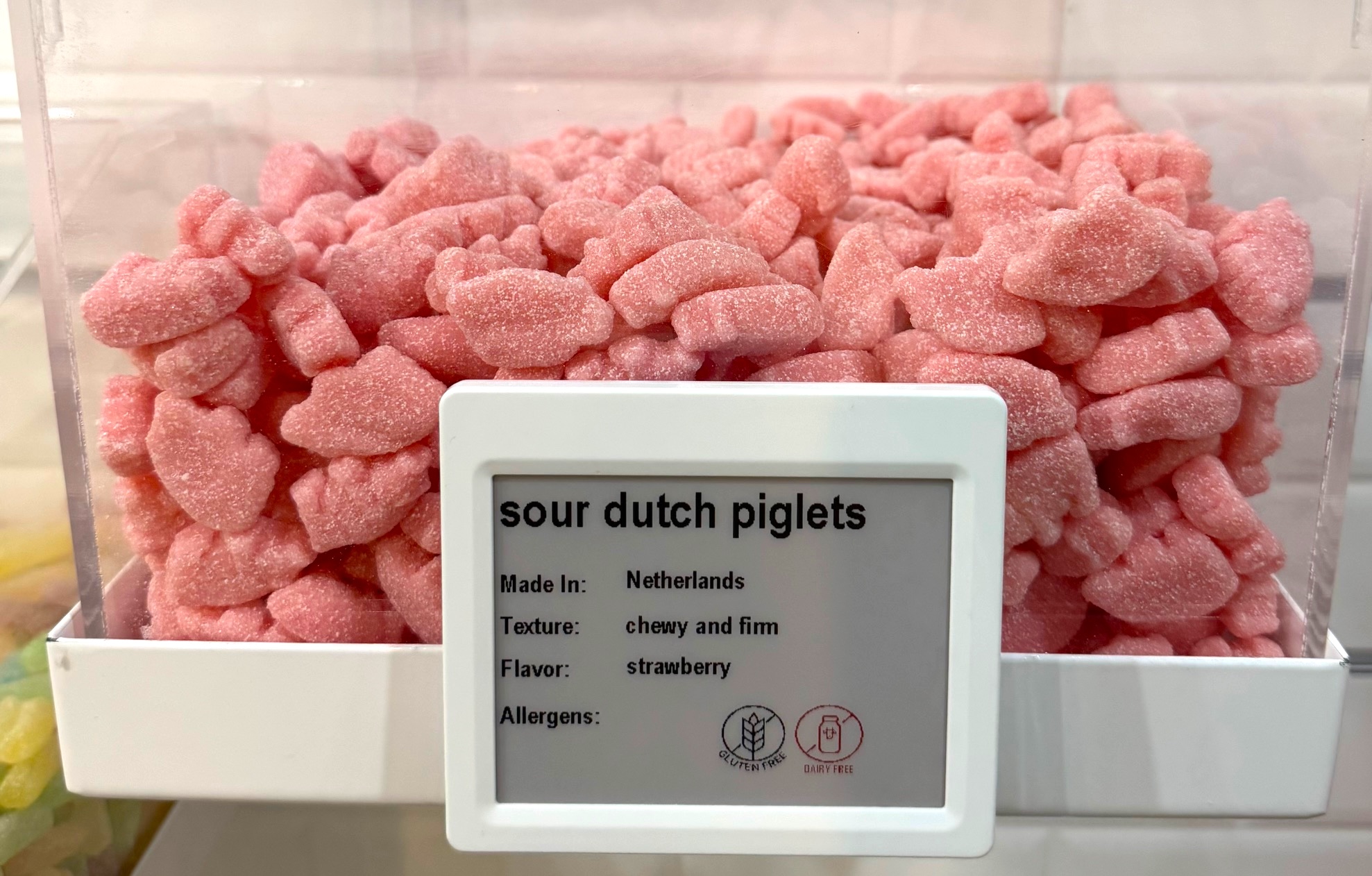 I immediately loved the simple design and self serve situation. So you grab a lil resealable bag and a plastic scooper and help yourself to whatever you like! With clear bins and big easy to read labels that detail the country of origin, texture of the treat, and the flavor profile, it’s easy to navigate your individual candy quest. And the selection there is amazing.