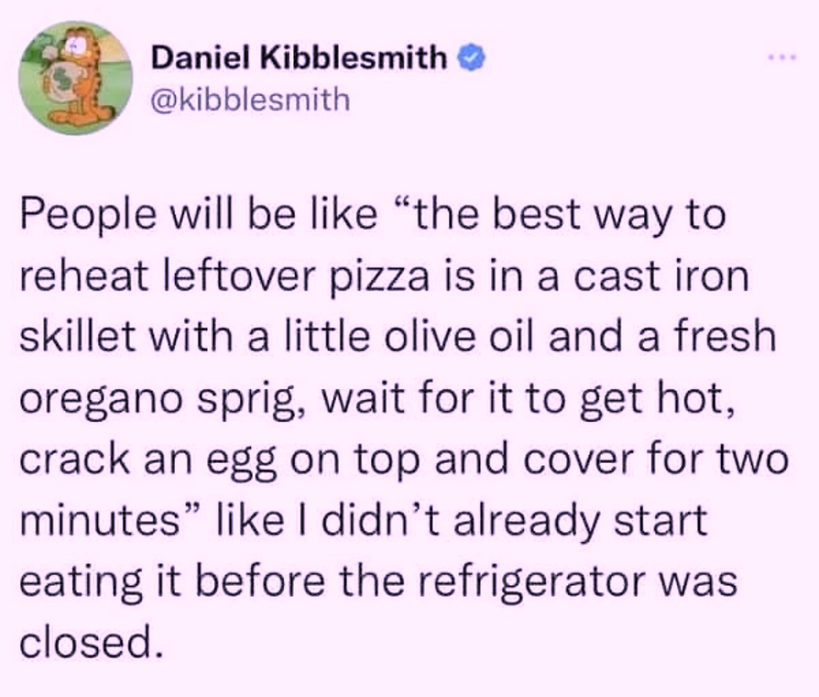 I love that quote about eating chips while you stand in front of the pantry deciding if you even want to eat chips. That is so me! Below is the pizza equivalent of that story, and funnier!! Like who hasn’t done this…