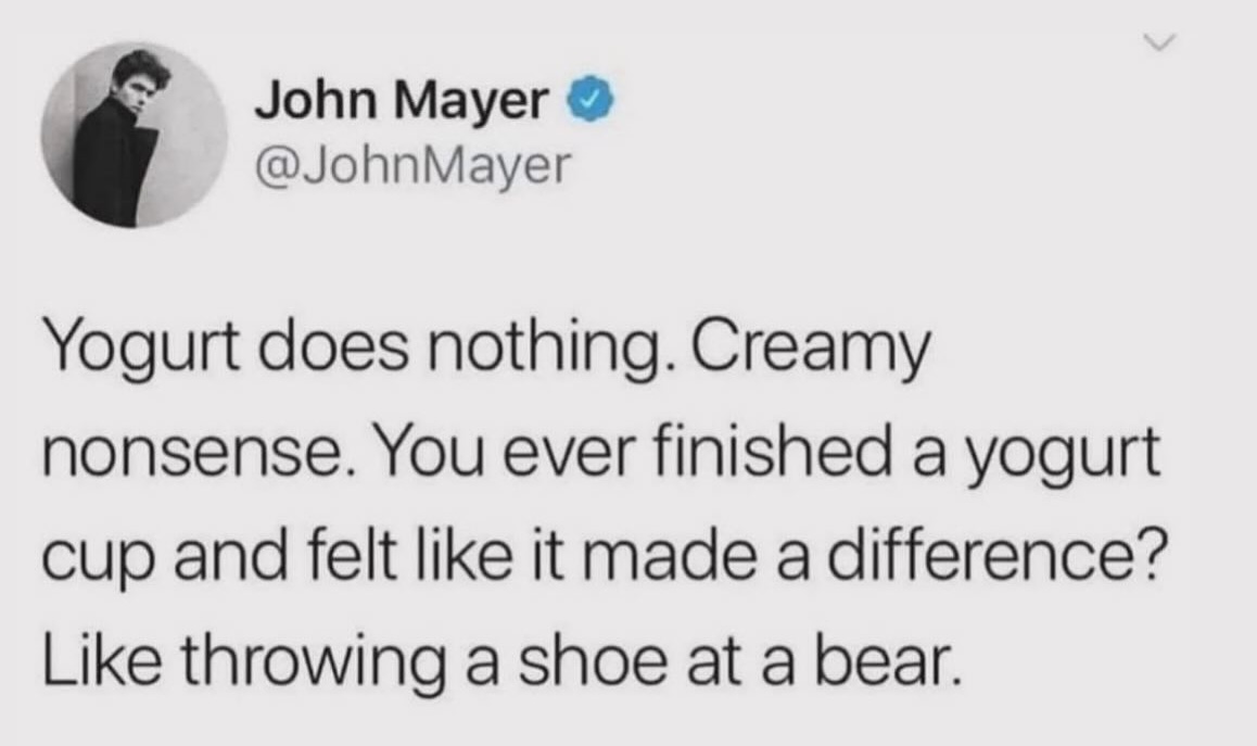 I happen to be a big fan of Greek yogurt. I love the thick creamy texture. I add a drizzle of Greek honey and some cut up fruit and love it as a meal or dessert. I add yog to pancake batter to zhuzh up the protein ratio, to boxed cake mixes for moistness, and use it to thicken dips or salad dressings. And it’s so much healthier than sour cream. But apparently the singer John Mayer does not agree…