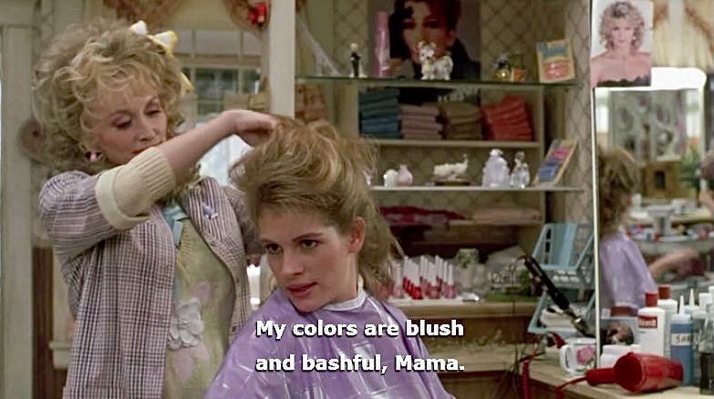 Who could forget Julia Roberts dynamic performance in Steel Magnolias. The newly engaged Shelby is asked by Truvy played by Dolly Parton what weddin’ colors she has chosen for her big southern celebration. Her reply? “Mah colors are blush and bashful.” Indeed. I’ve taken to using this line all the time. It’s just the perfect answer for so many questions. (What are you wearing to the conference? Mah colors are blush and bashful.)