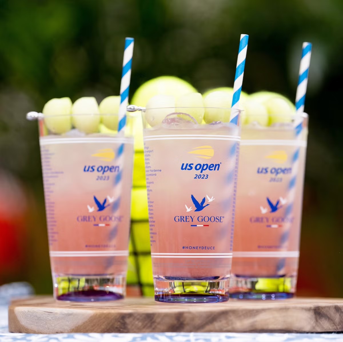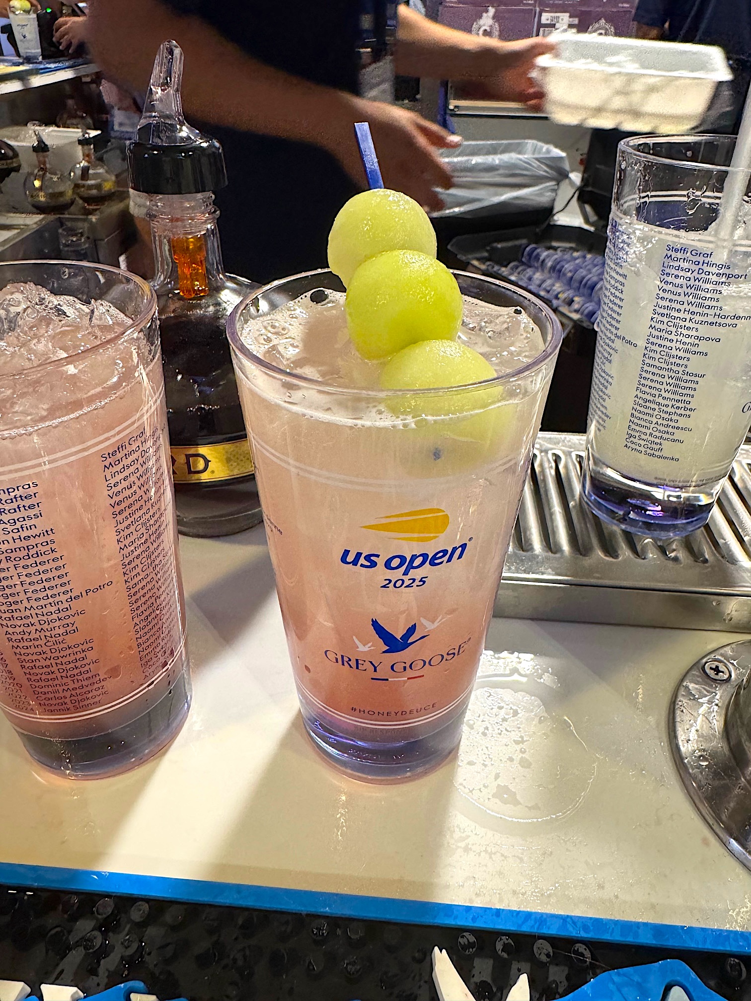 The Honey Deuce is Grey Goose Vodka mixed with lemonade that comes right out of the tap. This is poured into keepsake tumblers filled with ice. The barkeeps then add a few splashes of Chambord– a drink made from red and black raspberries, blackberries, cognac, vanilla, citrus peel and honey. This whole blend is then topped by a speared trio of hand scooped honeydew melon balls that perch precariously across the mouth of the glass. It’s a US Open tradition to have one but this year inspired fans were drinking them by the dozen and walking around with empty stacked glasses to prove their consumption. Odd yes, but very New York– overt competitive consumption at it’s best!