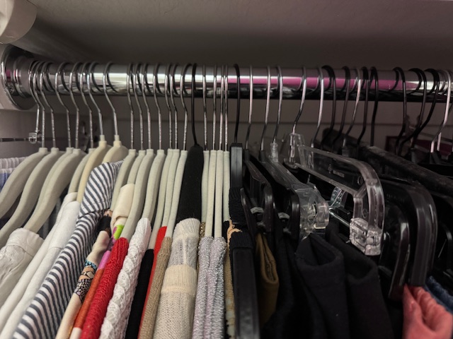 I’m a no stray hangers in the closet kind of gal too. When a piece of clothing is removed that was living on a hanger, that specific hanger goes to the hall closet to rest until her next assignment. Hangers there are further separated by type: wire hangers from my dry cleaner, clip hangers for pants and skirts, “good hangers” with the velvet overlay for tops, blouses, shirts and jackets, child sized hangers I use specifically for scarves, and lastly heavy hangers for outerwear. (Are you afraid? Ha. Don’t call the shrink yet. Just wait… there’s more!)