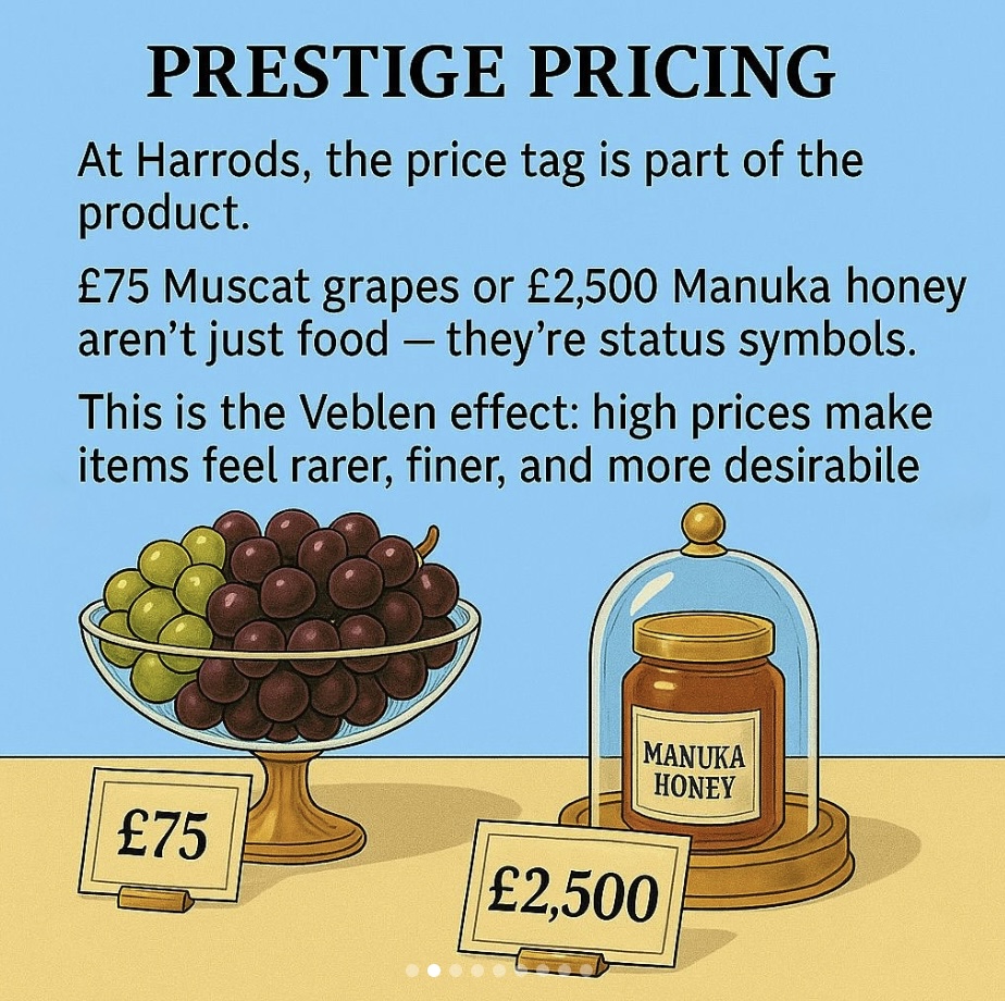 According to AI, “The Veblen Effect is a microeconomic concept describing a situation where a product’s demand increases as its price rises, a phenomenon driven by the desire to signal wealth and social status through conspicuous consumption. Named after social critic Thorstein Veblen, it contradicts the standard law of demand and is characteristic of “Veblen goods,” which are considered luxury items like high-end designer clothing, art, and exclusive cars, where high prices enhance their desirability.” Get it?