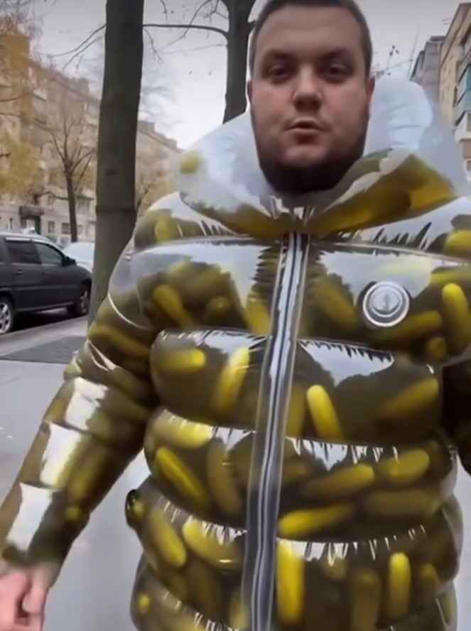 So we move onto the more practical use of food in a wearable. Check out this pickled genius who thought that sharable sours were a grand idea. But unless you own a meat locker, where are you storing this bad boy??