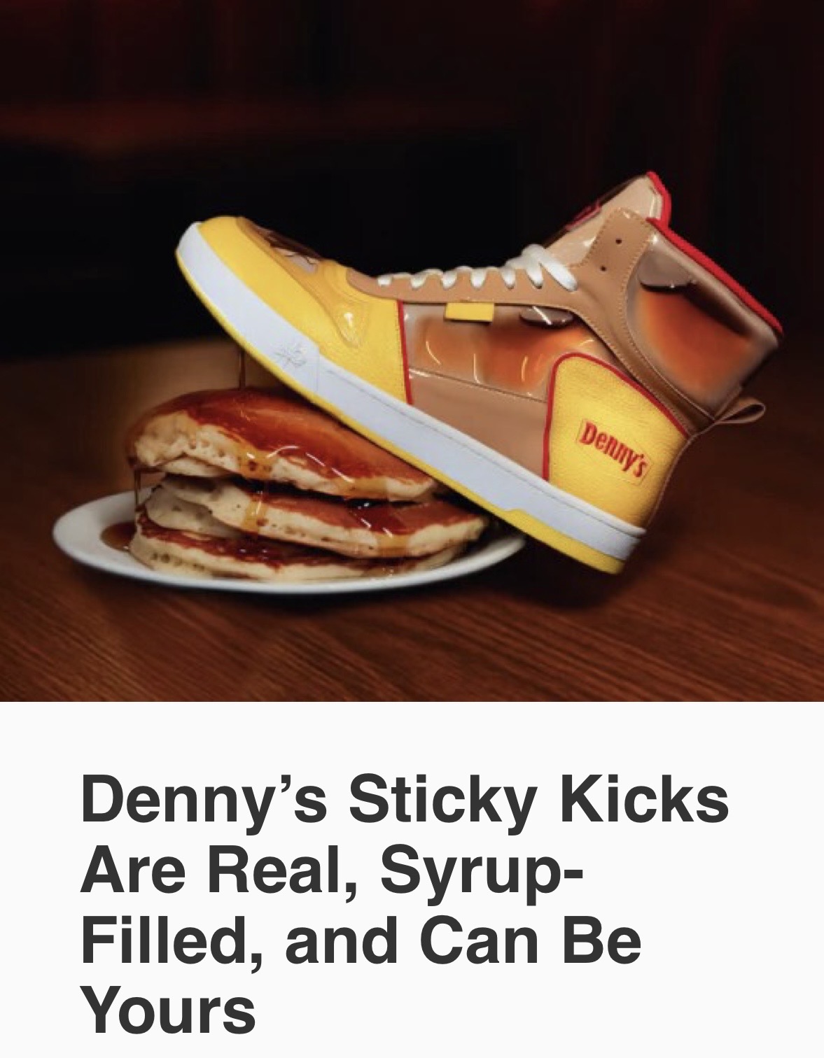 Getting over the embarrassment for that Dad, check out the weirdos who thunk up this crazy set of kicks. These Denny’s sponsored hightops contain actual syrup. I’m sorry. What??? Can you tell me one reason why having a sticky, bug-attractive substance in your shoes sloshing around while you walk can be considered a good thing? Shaking my head.