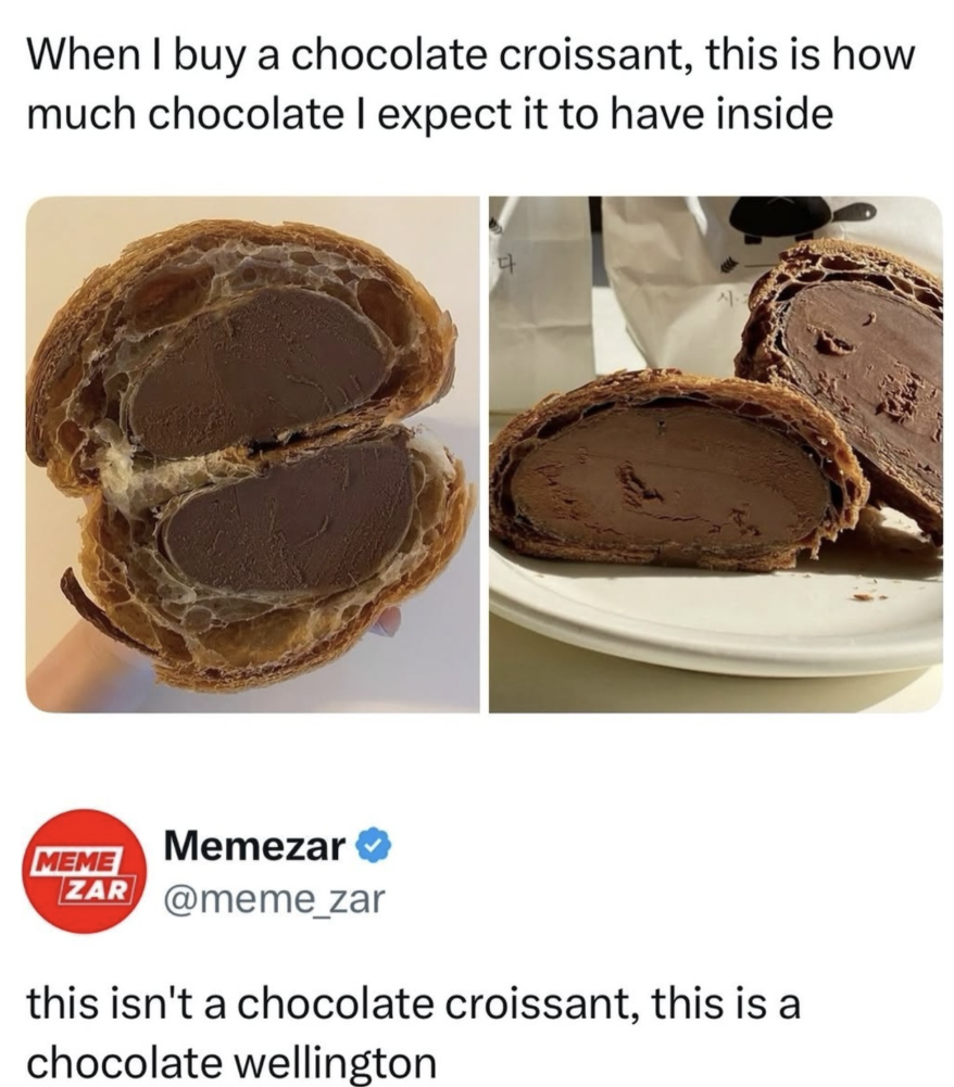 More often than not, we are disappointed when our expectations don’t match the reality of a particular situation. I try so hard to under expect with the hope that I may be surprised… but in a good way for a change. The next photo is just so true. I’m sure we can all relate to a pain au chocolate not having nearly enough chocolate. And I love the new title offered in the commentary! Hilarious and perfect. See what I mean…