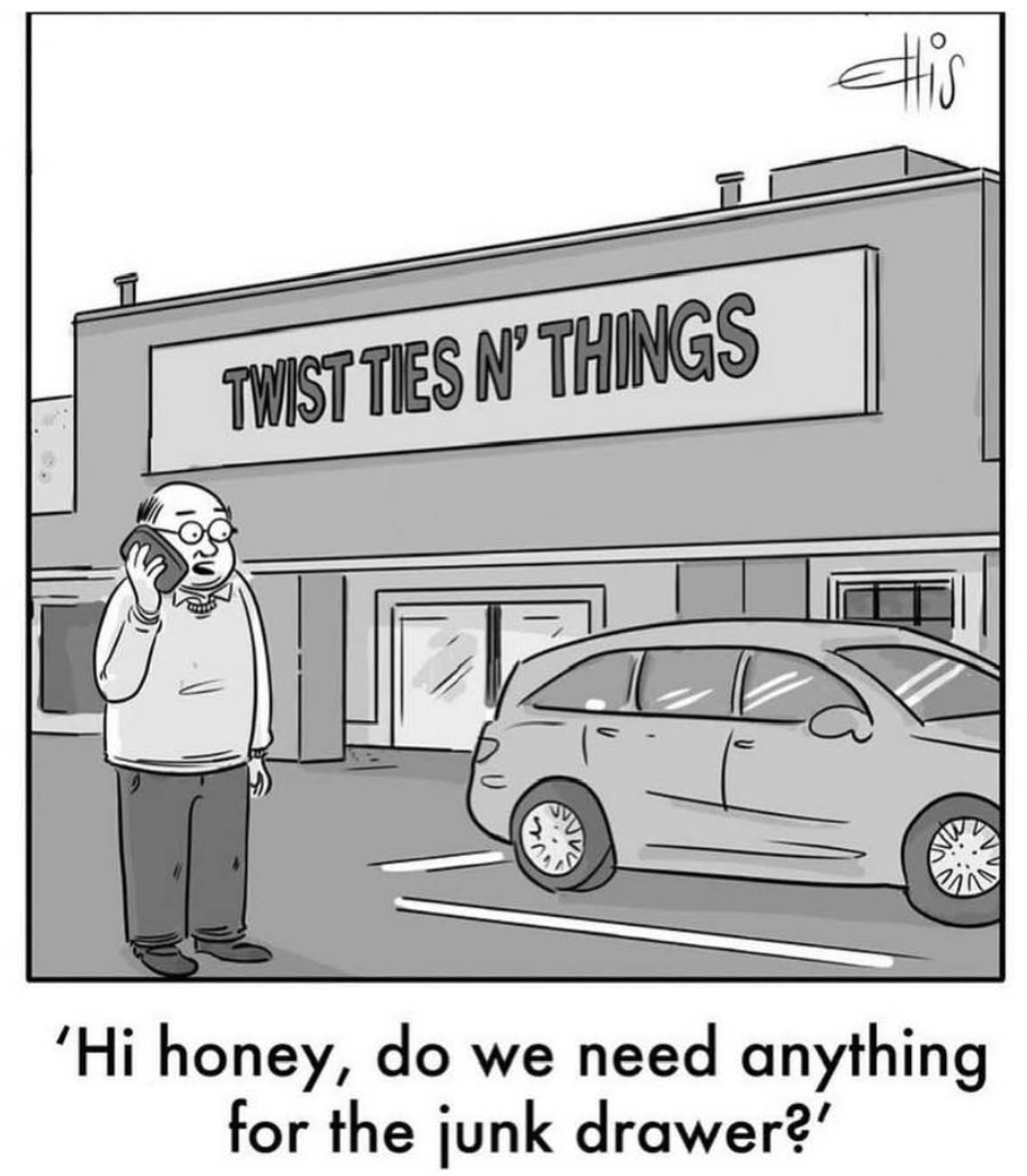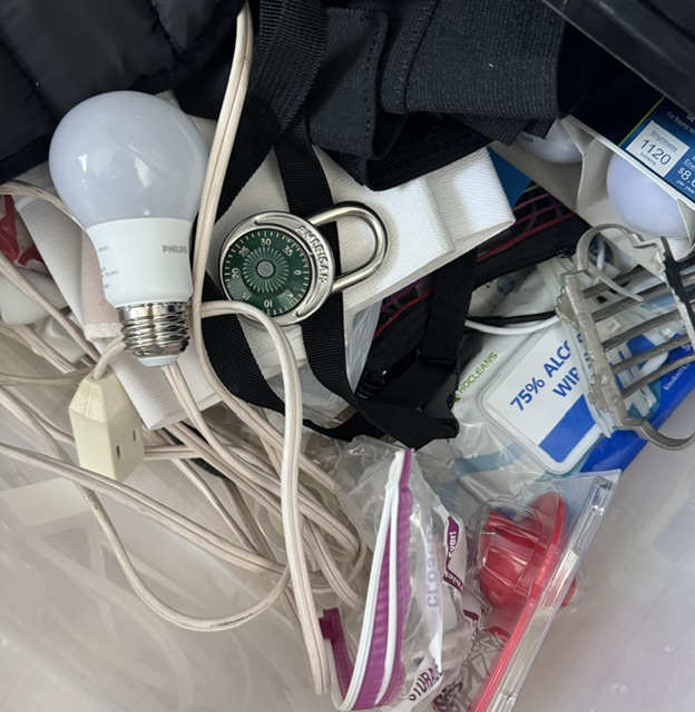 Exhibit C: Wires, cables, chargers from devices I no longer possess, hand me down extension cords, packs of electronics wipes, mismatched light bulbs, and so much clear Scotch tape made the jump! How did I miss all of these things? Now when I look around every item is suspicious. “Do you deserve a place here,” I say aloud? Necessary, needed, and nice have taken on new meanings.